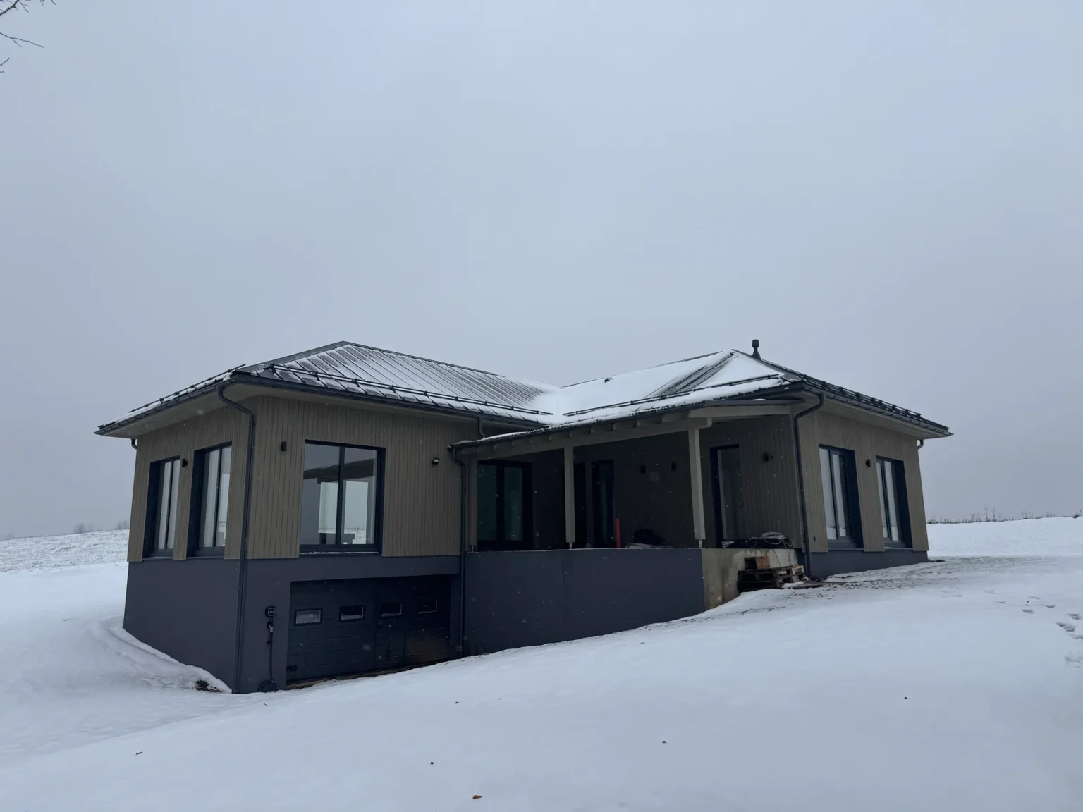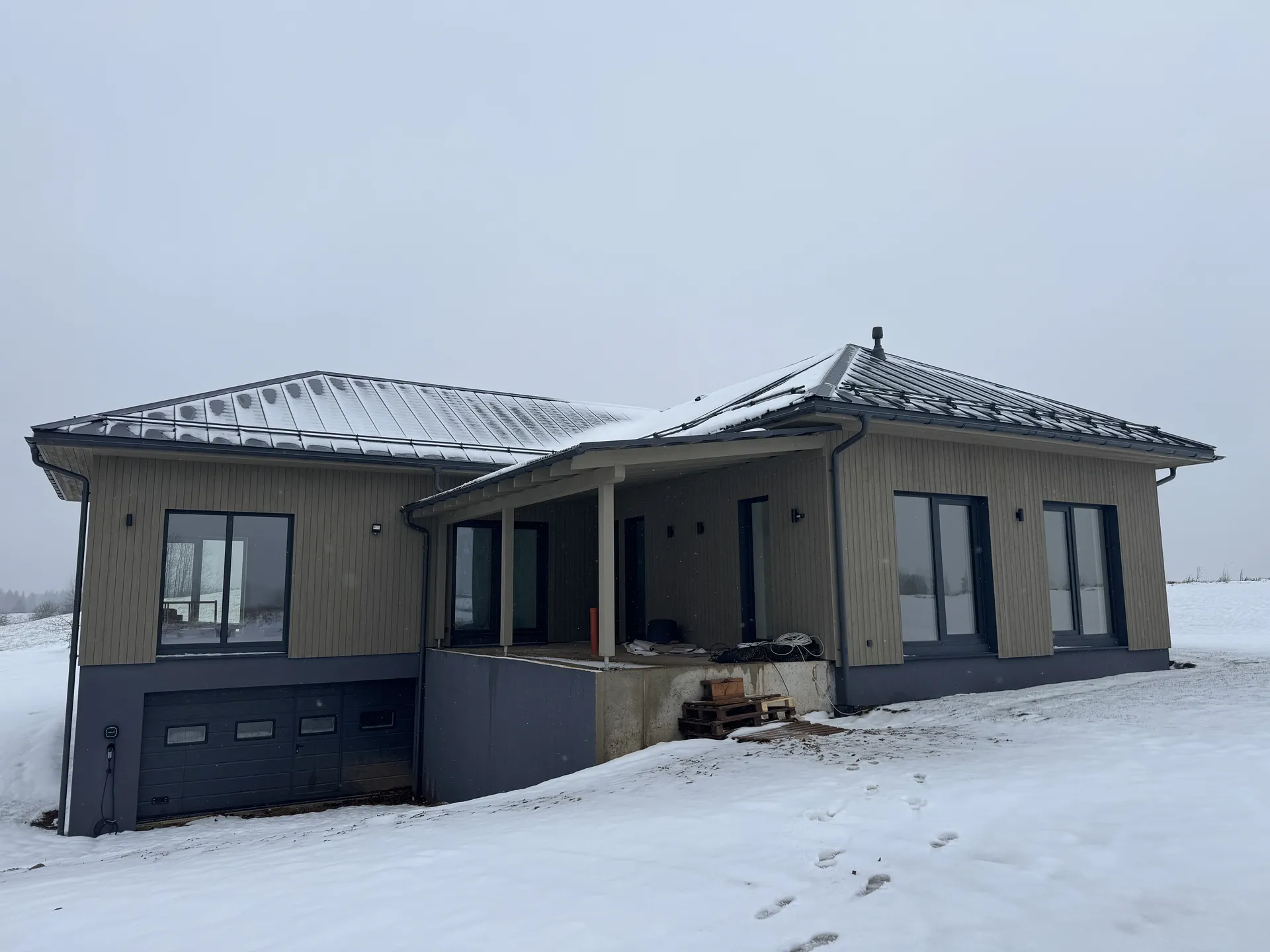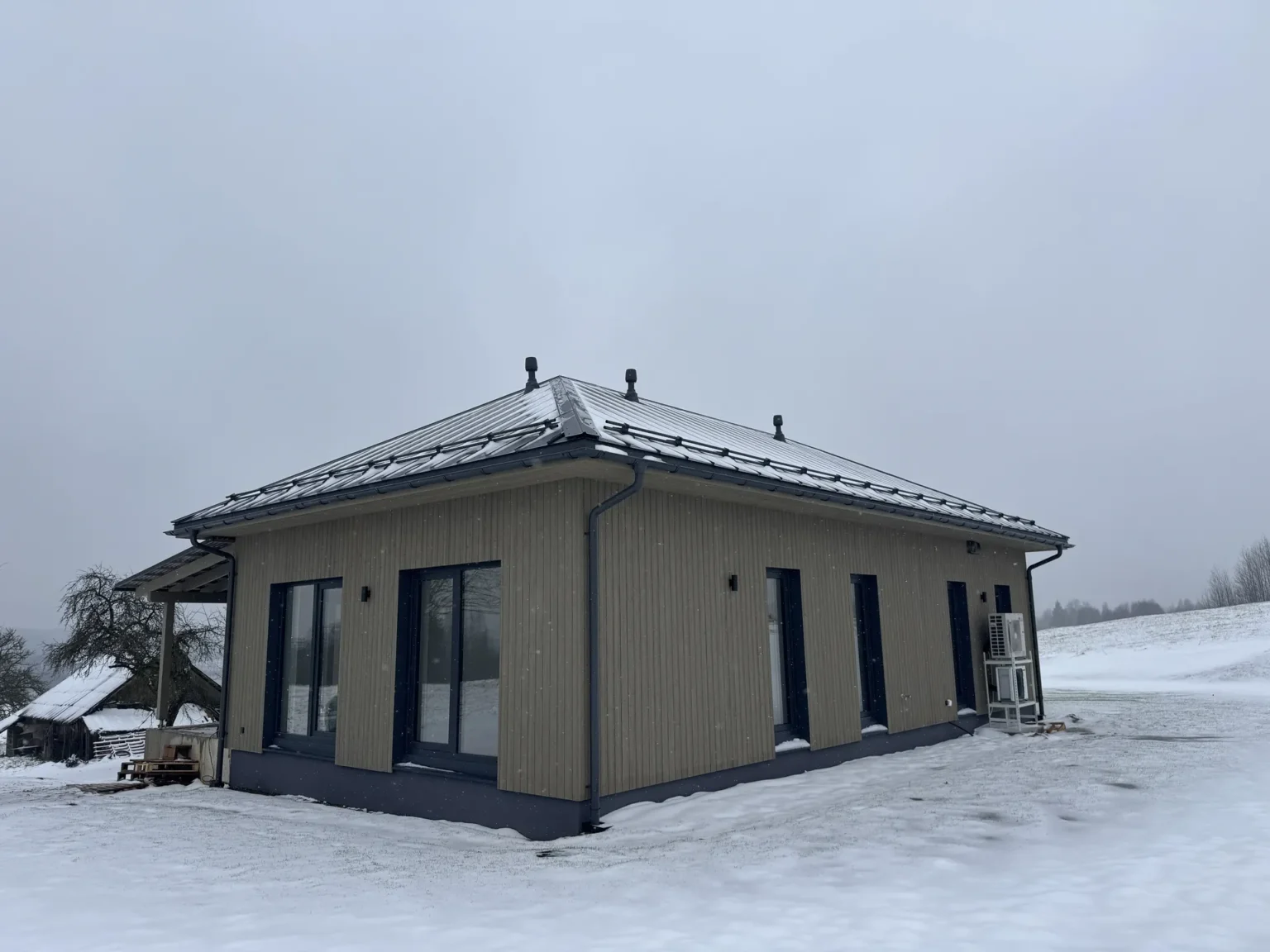 Modernus vieno aukšto skydinis namas Aukštadvaryje. Projektas pasižymi racionaliu išplanavimu ir greita statyba.